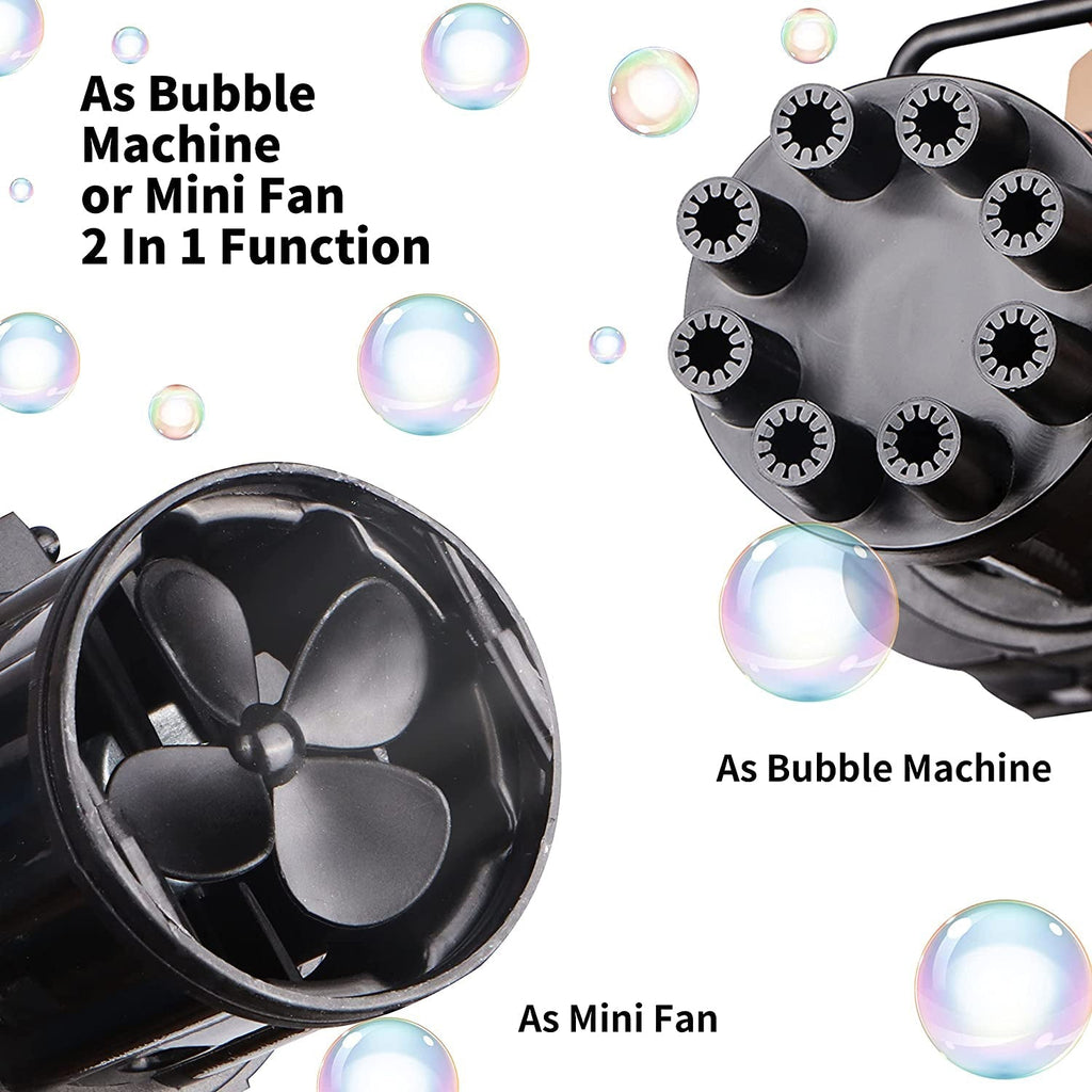 Mini Gatling Model 8 Holes Bubble Design 3 AA Batteries Required (not included). Looks cooler and more interesting.Cool Fan Mode The bubble machine can be used as a small fan, it will bring cool and comfortable wind. Take down the bubble machine gun head and turn it into a small fan. Easy To Use The bubble gun is made of quality ABS material, and has a handle design that fits the child's palm. Children can carry a bubble gun with them and enjoy the fun of bubbles.